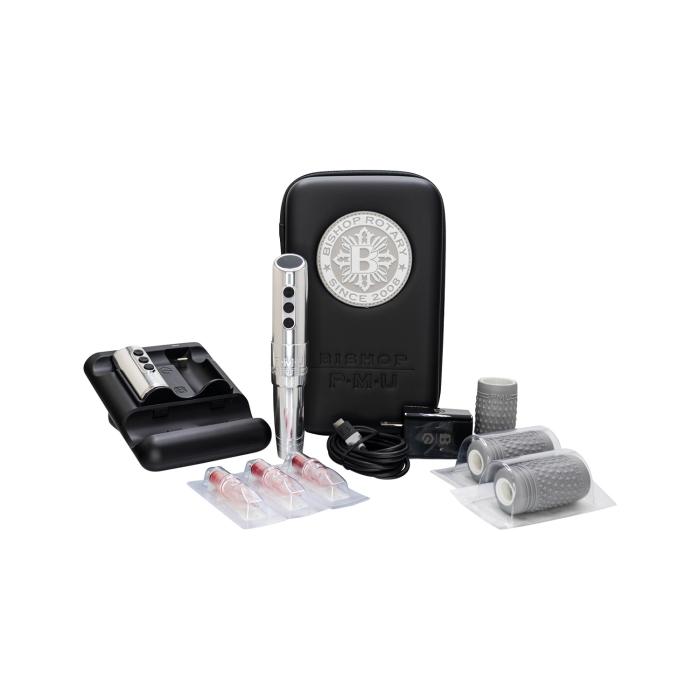 Acquistando il Set Completo della Bishop PMU Wand riceverai una macchina Bishop PMU Wand, due batterie, una docking station con slot per entrambe le batterie e la macchina, un cavo USB-C da 6 piedi e un adattatore a parete. Inoltre, riceverai 3 impugnature monouso e 3 cartucce di aghi, tutto in una custodia da viaggio elegante e resistente con chiusura a zip!