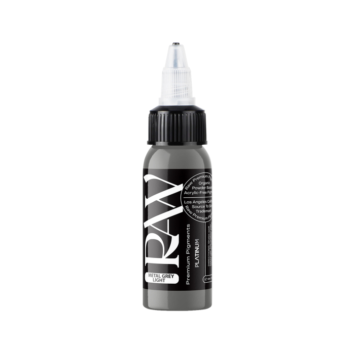Metal Grey Light è un inchiostro per tatuaggi grigio molto chiaro che può essere schiarito o scurito e si assorbe facilmente nella pelle, della linea Platinum di Raw Premium Pigments, conforme alle normative EU REACH.