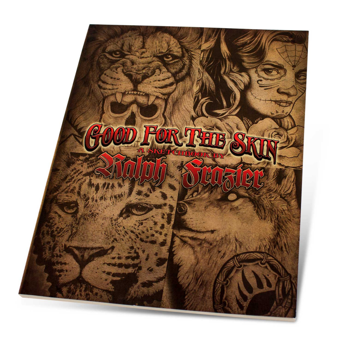 Good for the Skin di Ralph Frazier contiene 40 pagine con arte black & grey su un solo lato. Un ottimo libro di ispirazione per un artista del tatuatore. Le pagine sono stampate su carta cartoncino colore crema. Ralph è un apprendista presso Stinky Monkey Tattoos.