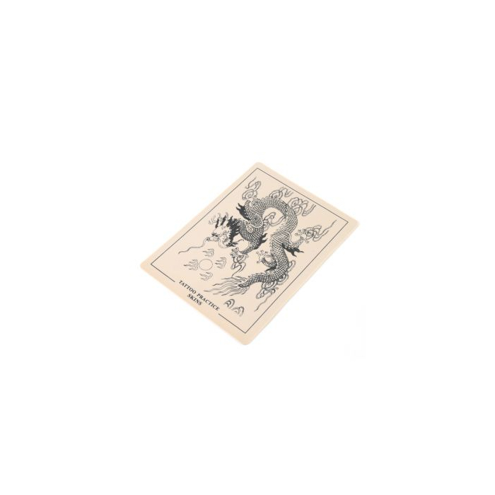 Questo strato di pelle per pratica del tatuaggio è perfetto per provare diversi design di tatuaggi prima di lavorare sulla pelle vera. Questo strato contiene design di draghi. La pelle è approssimativamente 21cm x 15cm.