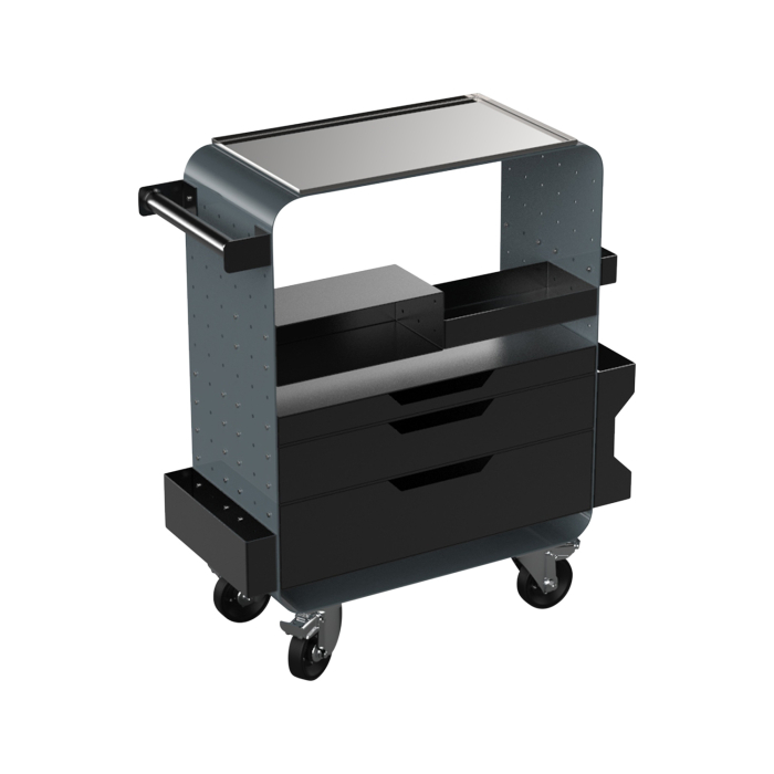Kwadron’s, la postazione di lavoro modulare Impala offre un fissaggio con ripiani e cassetti indipendenti, permettendo all'artista di personalizzare la propria stazione in modo semplice e veloce. La postazione è montata su quattro ruote robuste bloccabili, rendendo semplici gli spostamenti nello studio. Tutte le parti della postazione di lavoro sono fatte di acciaio inox e ricoperte di una vernice di alta qualità per una durata maggiore e per facilitarne la pulizia. Questa postazione consiste in una struttura base esterna disponibile in quattro colori (Giallo, Verde Militare, Grigio e Nero), e di elementi modulari in nero lucido. Questa è la versione grigia.