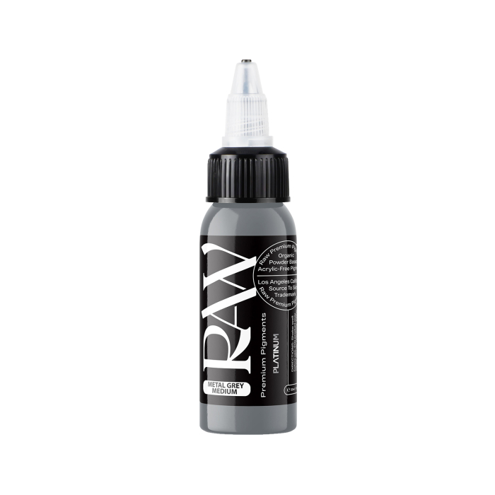 Metal Grey Medium è un inchiostro per tatuaggi grigio profondo con un tocco di colore proprietario per garantire che guarisca senza toni verdi o gialli, della linea Platinum di Raw Premium Pigments, conforme alle normative UE REACH.