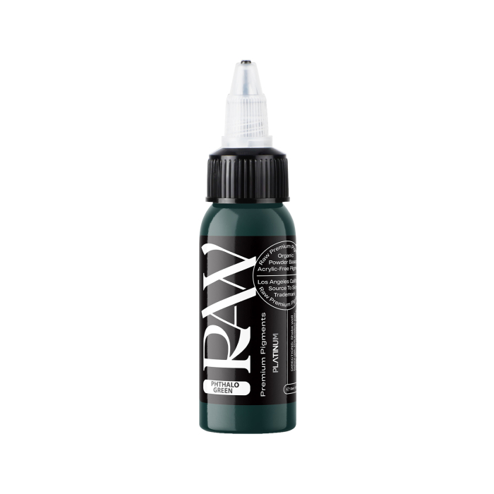 Phthalo Green è un inchiostro per tatuaggi verde scuro intenso della linea Platinum di Raw Premium Pigments, conforme alle normative UE REACH.